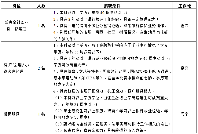金华银行嘉兴分行成立于2015年4月,现下辖嘉兴海宁支行。自开业以来,坚持“以客户为中心”理念,大力支持实体经济发展,深化转型发展思路,不断夯实和创新管理,积极履行并承担社会责任,赢得了广大市民的赞誉和好评。招聘岗位及要求如下: