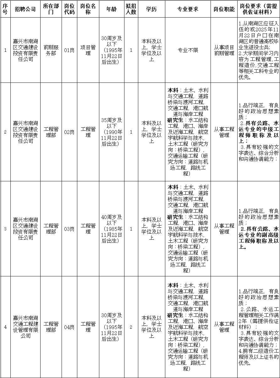 嘉兴市南湖区交通建设投资有限责任公司及下属子公司公开招聘工作人员公告