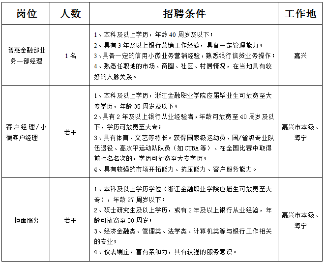 金华银行嘉兴分行招聘公告