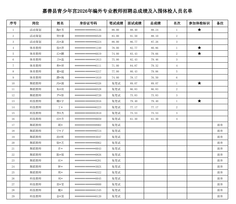 嘉善县青少年宫2026年编外专业教师招聘总成绩及入围体检人员名单公示